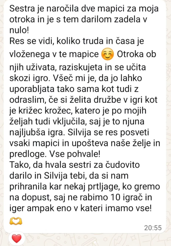 Sem Silvija, ustvarjalka Otrokove mapice – ročno izdelanega pripomočka, ki združuje igro, učenje in čarobnost otroškega sveta. Moja ideja se je rodila iz ljubezni do otrok, ustvarjanja in želje, da bi vsak otrok imel nekaj, kar je narejeno prav zanj. Vsaka mapica je unikatna in personalizirana, prilagojena starosti, zanimanjem in razvojnim potrebam posameznega otroka. Skozi zabavne aktivnosti otroci razvijajo fino motoriko, govor, domišljijo, koncentracijo in logično mišljenje. Mapice vključujejo različne igre, naloge in izzive, vse izdelane ročno in s posebno pozornostjo. Pred izdelavo se vedno posvetujem s starši, saj prav oni najbolje poznajo svojega otroka. Verjamem, da se otroci najbolje učijo skozi igro – in prav to jim Otrokova mapica omogoča. Primerna je za vsakdanjo igro doma ali kot posebno in izvirno darilo. Vsaka mapica je narejena s toplino, ljubeznijo in mislijo na to, kar je otrokom res pomembno. Z Otrokovo mapico želim otrokom podariti več kot le igračo – želim jim podariti doživetje. Hvala, ker zaupate v moje delo in vizijo. Z veseljem ustvarim nekaj prav posebnega tudi za vašega malčka.
